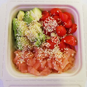 Riso basmati (100gr), salmone selvaggio affumicato (50gr), avocado (50gr), pomodorini (50gr) e sesamo. A parte, ma incluso, condimento composto da: salsa...