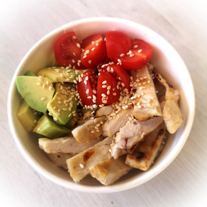 Riso basmati (100gr), pollo alla griglia (50gr), avocado (50gr), pomodorini (50gr) e sesamo.