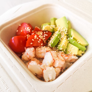 Riso basmati (100gr), gamberi al vapore (50gr), avocado (50gr), pomodorini (50gr), sesamo. A parte, ma incluso, condimento composto da: salsa di soia,...