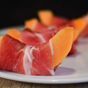 Piatto di prosciutto crudo (riserva 18 mesi) affettato e melone mantovano.